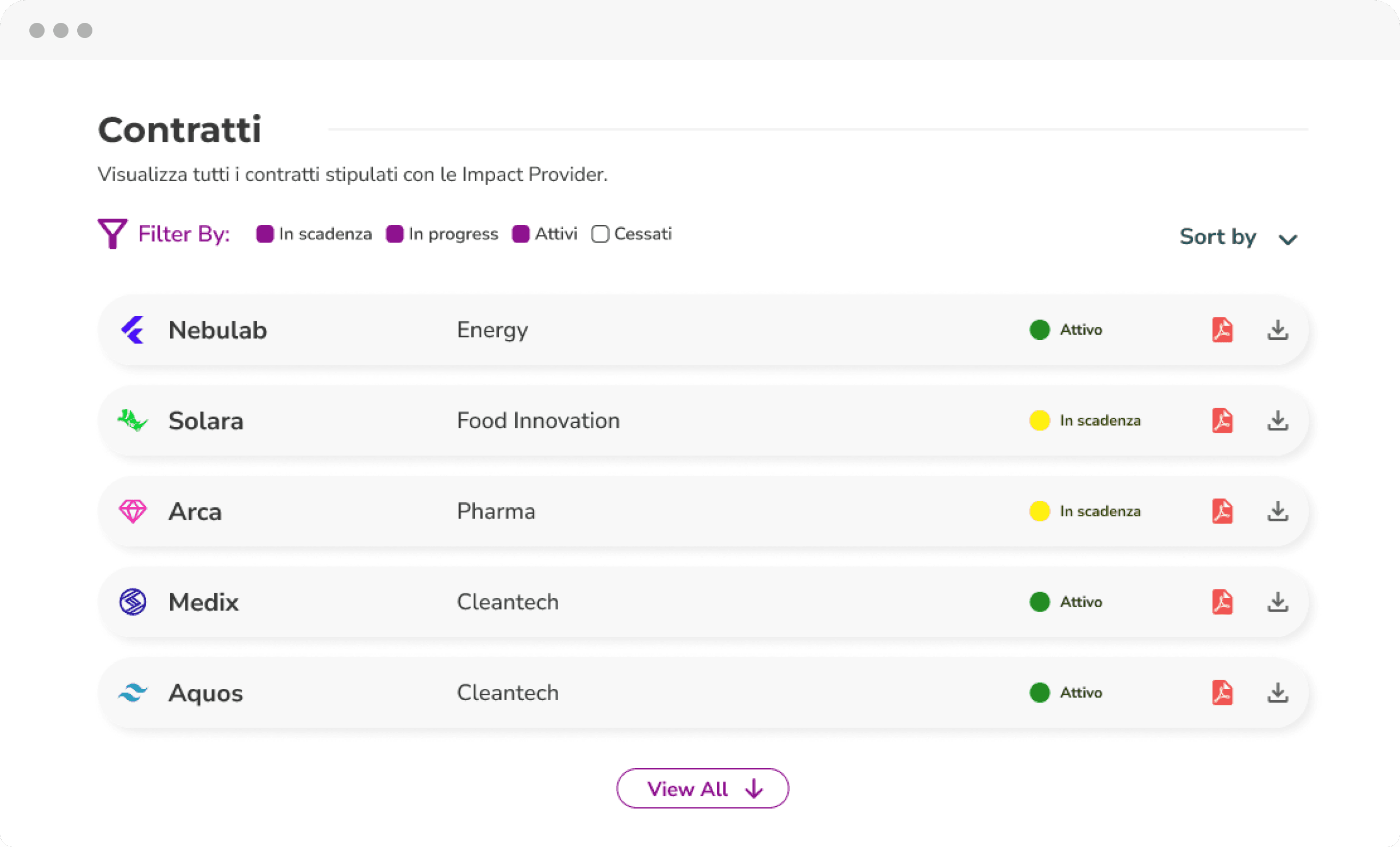 Tieni traccia dei tuoi progressi con i diversi impact provider e raccogli in un unico posto attestati e contratti in essere.