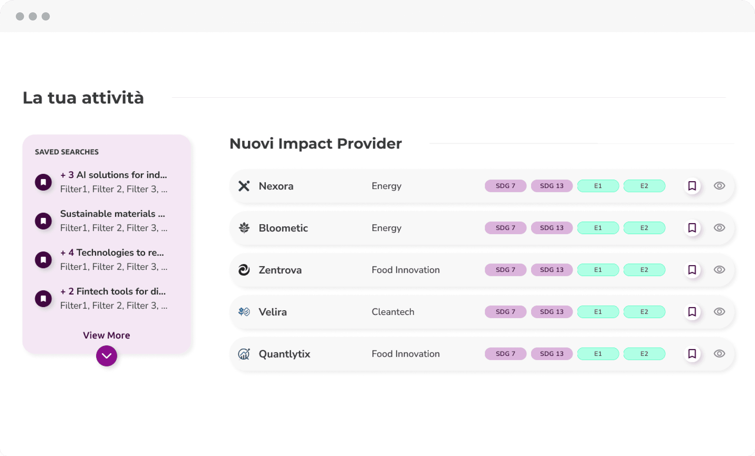 Trova, contatta e gestisci i tuoi Impact Provider in modo semplice e veloce. Con strumenti di ricerca avanzata, gestione smart e intelligenza artificiale, hai tutto ciò che serve per ottimizzare i processi e migliorare l'allineamento con SDGs e standard ESRS.
