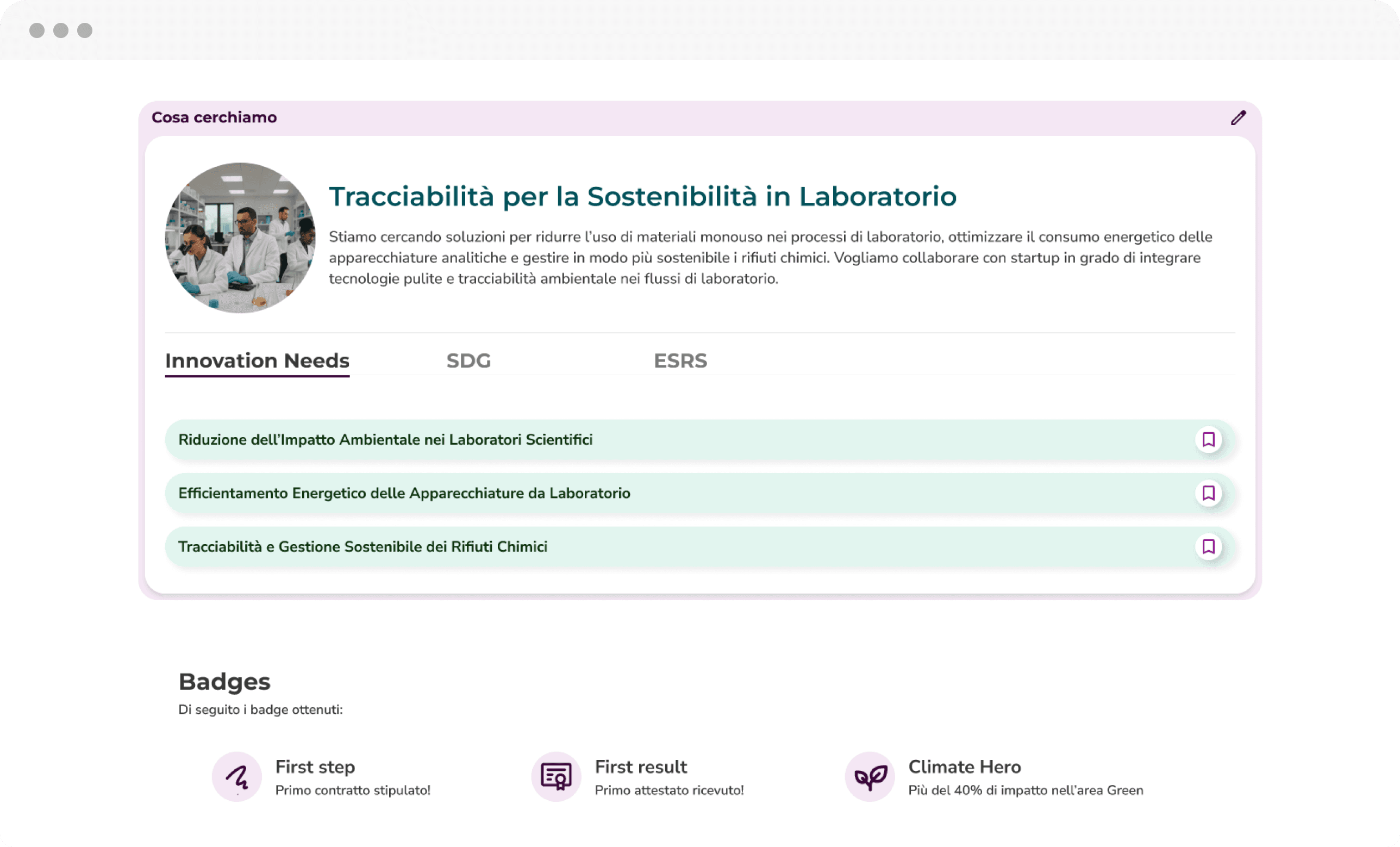 Per mettere in contatto impact providers, come startup e PMI che offrono servizi ESG, con altre aziende che necessitano di migliorare la loro performance di sostenibilità.